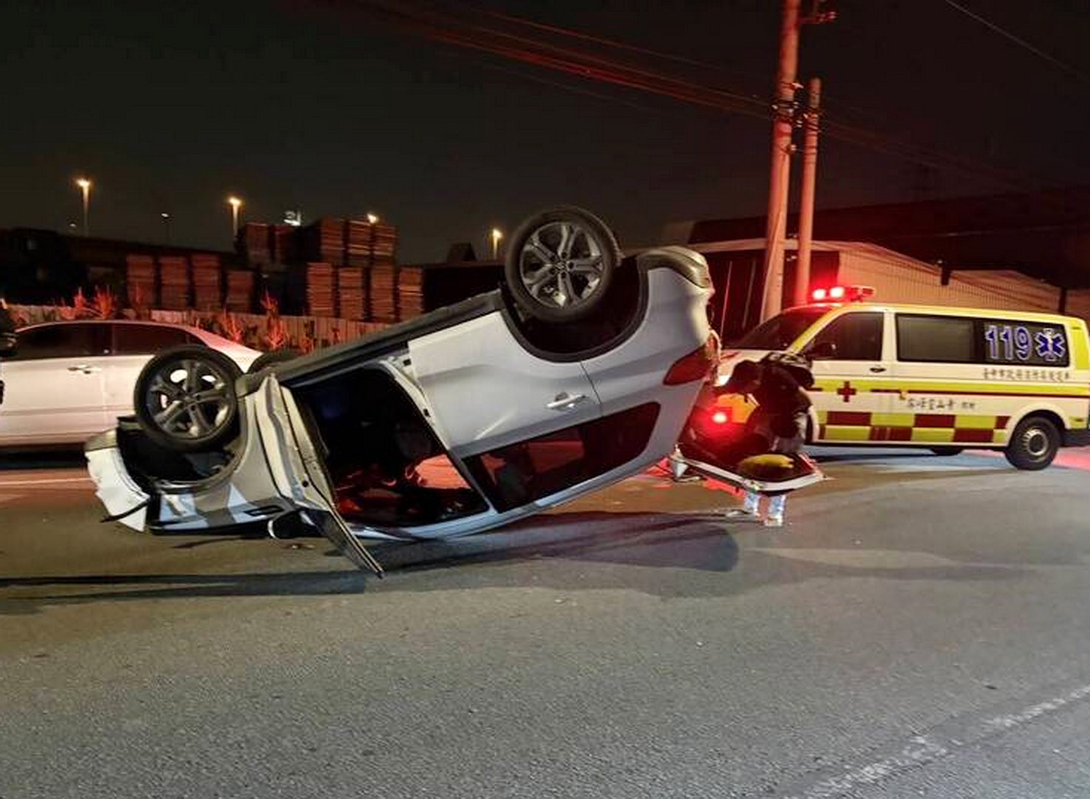 台中男開車恍神自撞路邊停車翻車「4輪朝天」