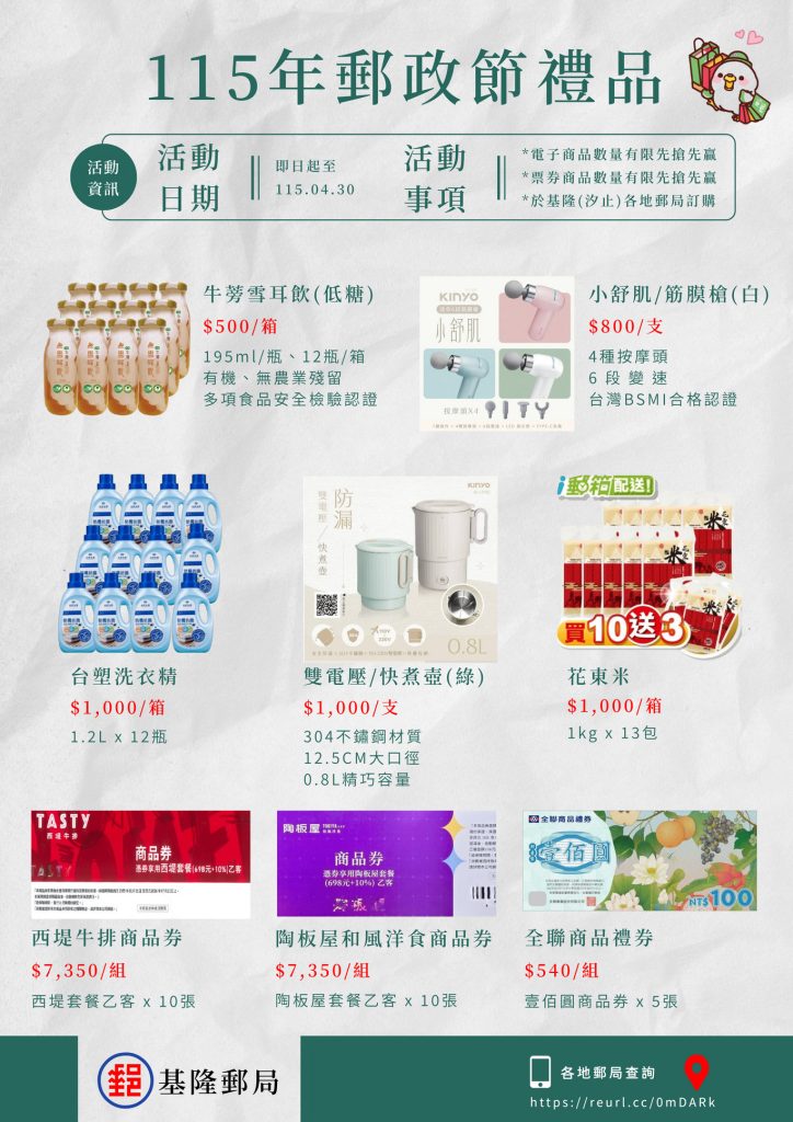 中華郵政股份有限公司基隆郵局郵政節特別於郵政節期間推出郵政商品優惠活動,即日起至四月三十日止邀請民眾一同感受郵政服務的溫度,並選購兼具實用與紀念價值的郵政商品。