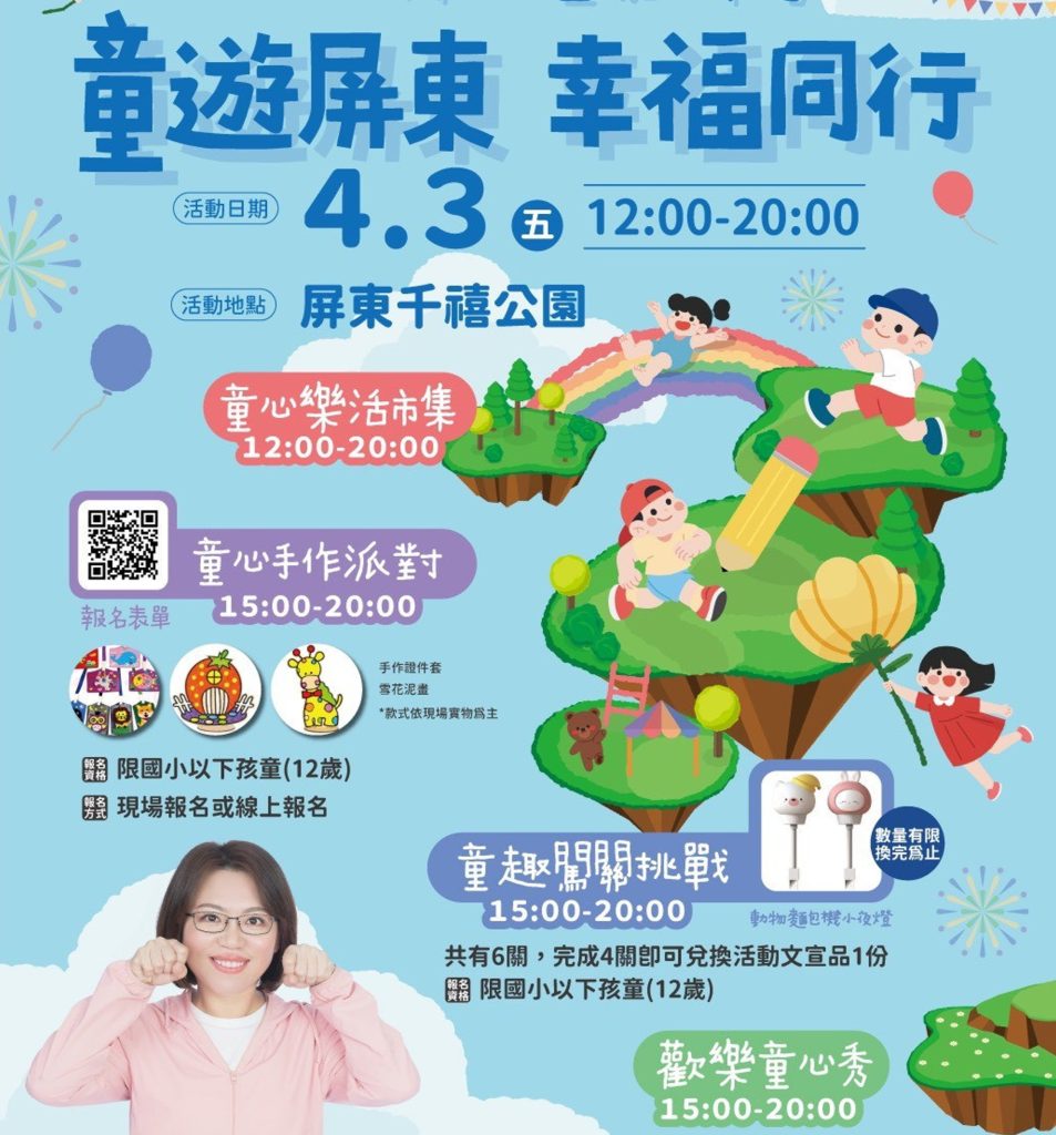 屏東市公所將於四月三日在千禧公園,舉辦「童遊屏東.幸福同行」兒童嘉年華會,活動從下午三時一路狂歡到晚上八時,邀親子同遊充滿歡笑與驚喜的城市遊樂園!