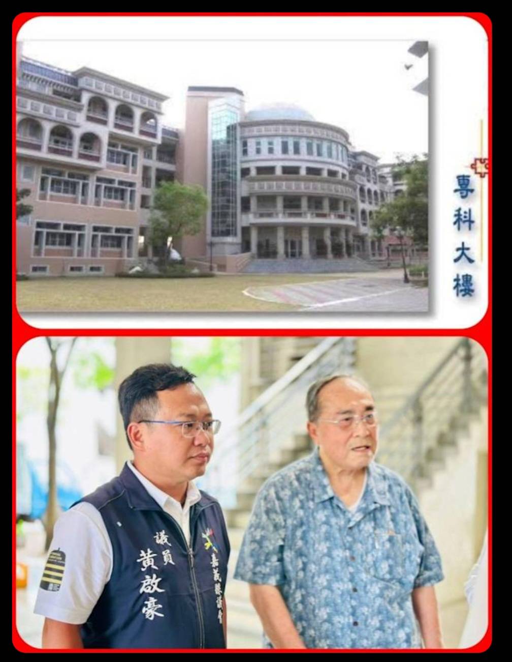 嘉義縣議員黃啟豪(下左一)奔走,創辦人何明宗(下右一)允諾,協志工商(上)校產贈捐嘉縣府接管,將轉型為「協志美術館」。(記者湯朝村攝)