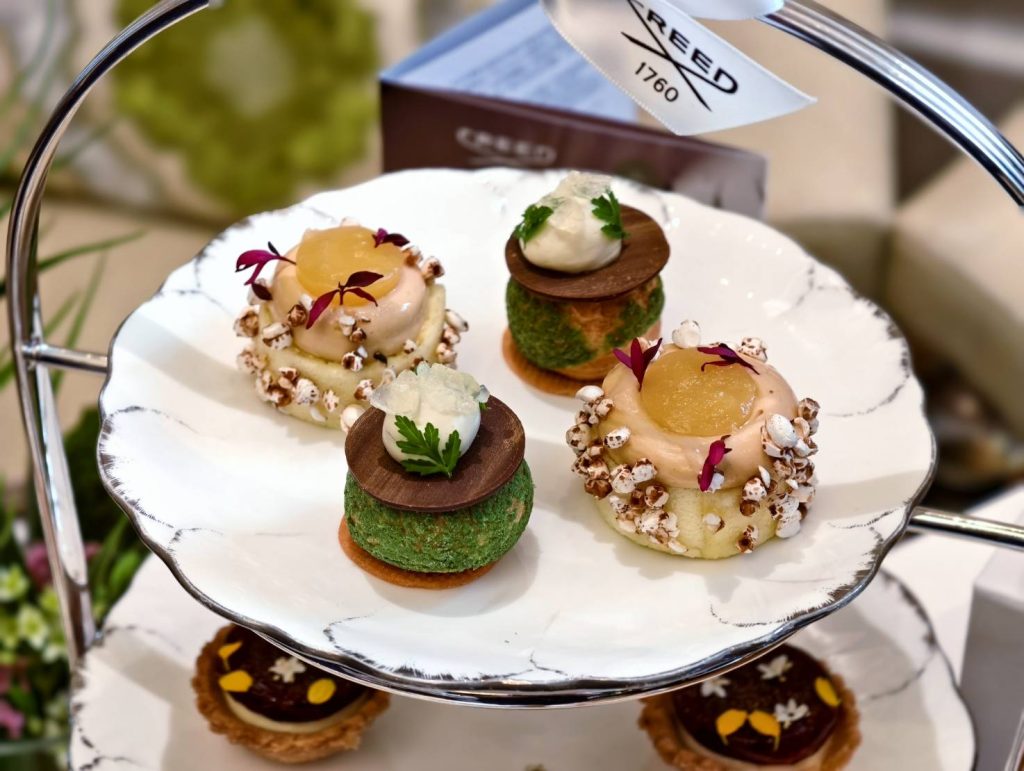 全新「岩蘭野境」英式下午茶靈感來自CREED新上市的「岩蘭野境」木質花香調,設計主軸聚焦在「英倫野餐」,午後悠閒漫步在花園秘境,靜下心品味幽然花香的獨特韻味。此次甜點由新任行政西點主廚 胡利雲一手打造,其中最吸睛非「焦糖鳳梨鮮奶油蛋糕」莫屬,鬆軟蛋糕體放上焦糖奶霜妝點,有趣的是入口帶有濃郁漿果香氣,香甜不膩,讓人一試難忘。