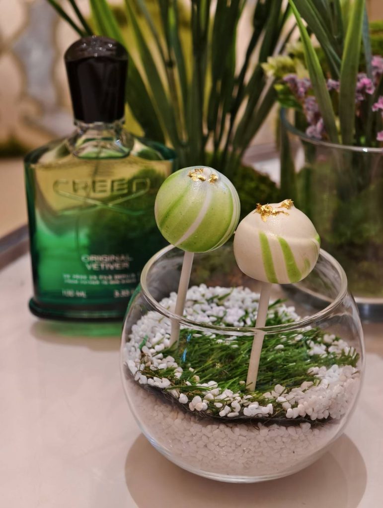 以金箔點綴的「東加豆巧克力奶霜蛋糕」外型圓潤,香甜巧克力慕斯蛋糕口感綿密,主廚特別加入東加豆增添風味,尾韻帶有淡淡辛香風味,晶亮的焦糖巧克力鏡面外層超吸睛,讓人愛不釋口。少女粉絲最愛「柚子棒棒糖」造型小巧,薄脆巧克力外殼入口爆漿,能嚐到檸檬蛋糕與柚子慕斯清香,讓人置身春日野餐的氛圍。