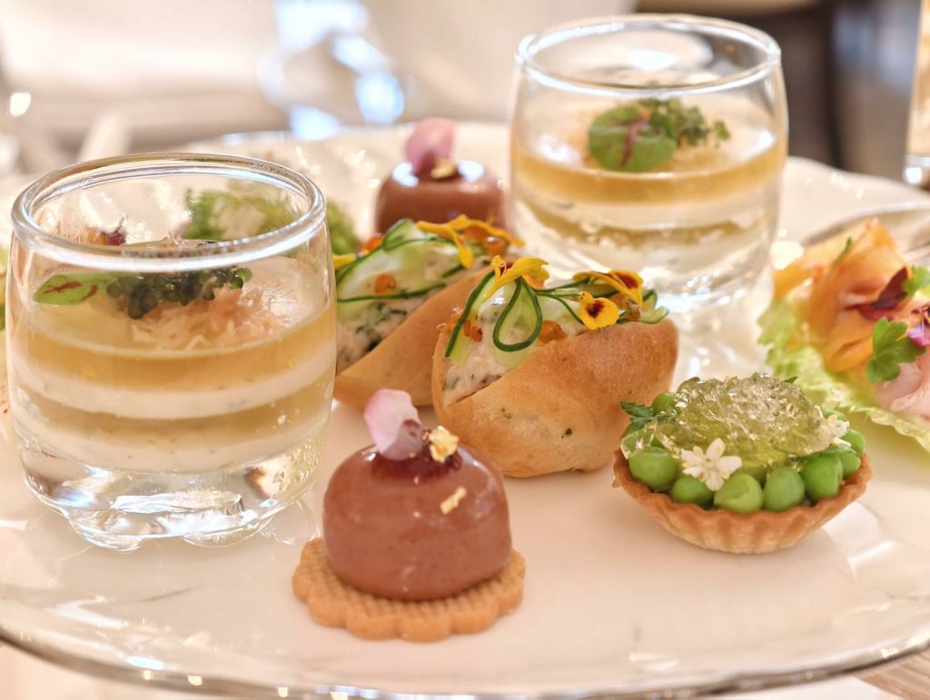 鹹點則由文華Café主廚 盧奕翔延續「英倫花園」為發想,選用時令蔬果與鴨肝慕斯、煙燻豚里肌等元素,打造5款精緻小點。推薦必嚐的「鮪魚菠菜香草麵包」以小巧香草麵包為基底,夾入鮪魚與菠菜餡料,搭配粉紅胡椒妝點,帶給味覺全新層次感。另款「甜豆酪梨塔」以酥脆塔殼裝盛翠綠甜豆搭,佐以綿柔酪梨與薄荷果凍,入口微酸超開胃。