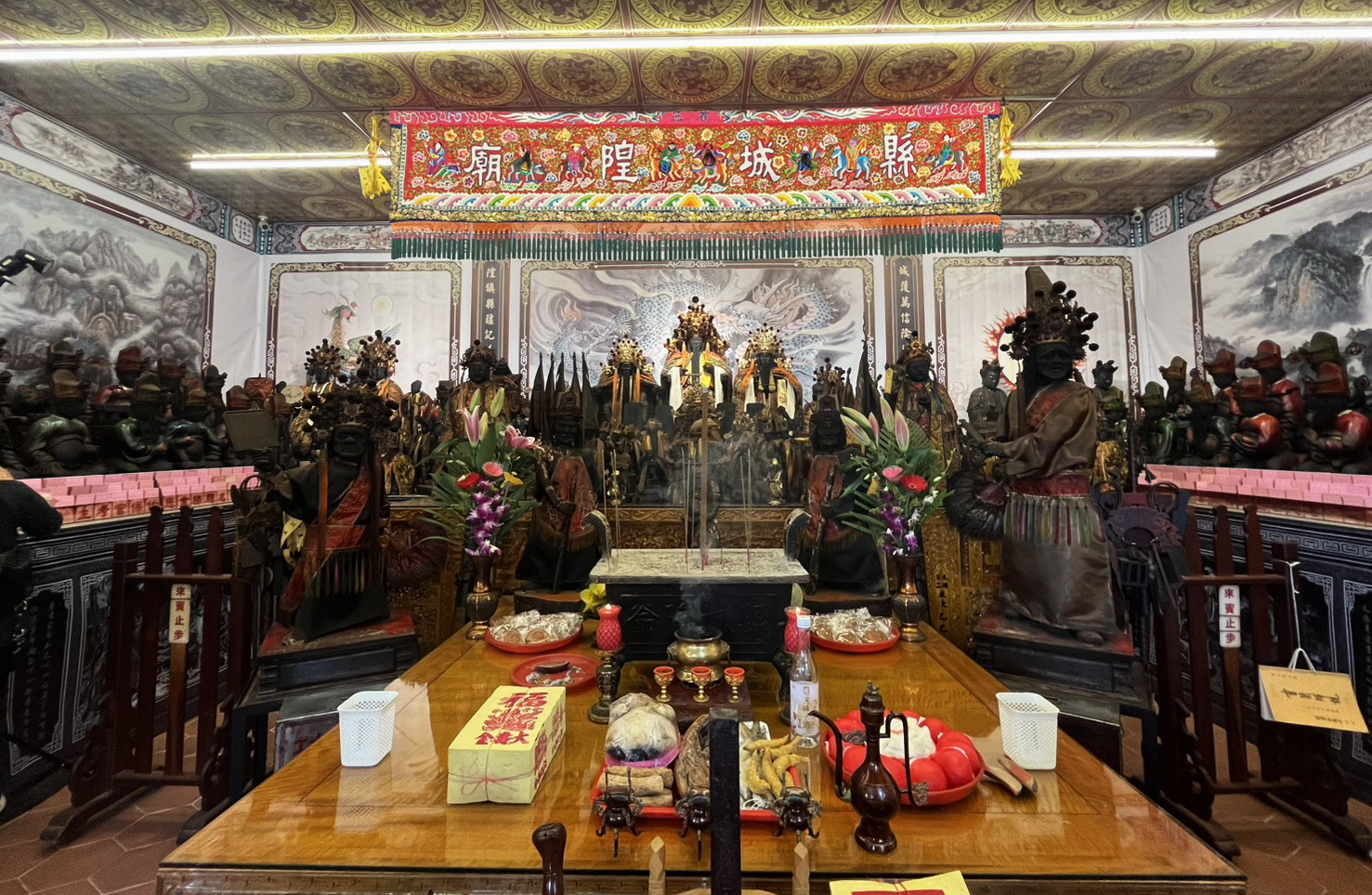 縣城隍廟成立於康熙五十年間,曾於咸豐十年重建,一種說法是目前鎮殿三尺六的金面軟身顯佑伯即塑於當時,距今已有一百六十五年歷史,昨天的重頭戲即是將鎮殿老城隍爺以及所屬的十尊大小不等城隍爺們,在出火儀式之後,全部移駕至臨時行館。
