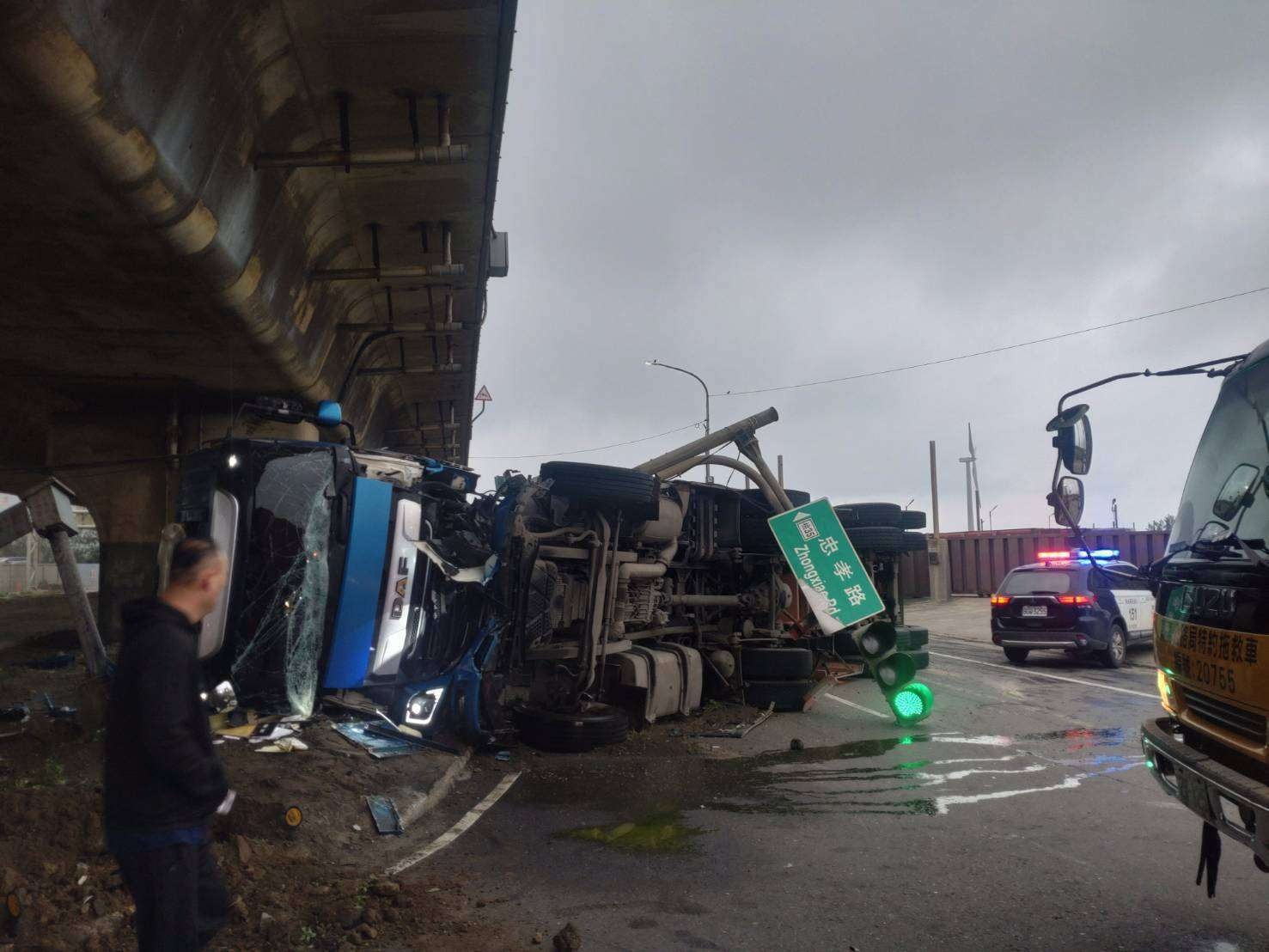 桃園市48歲陳姓男子於今(24)日清晨5時許,駕駛曳引車沿台61線中線車道往觀音區方向行駛,行經忠孝路口時不慎擦撞內線左轉的自小客車,導致曳引車翻覆撞斷路口號誌桿,南下車道暫時封閉,上午9時21分許排除事故現場,車道已可通行。