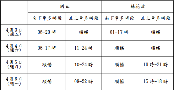 一一五年清明連假自四月三日起至六日共計四天,考量清明連假為國人相當重視的節日之一,宜蘭縣政府交通處依據往年經驗,預估連假期間將有大量車潮湧上國道,國道五號單日雙向交通量預估達七萬輛次以上,部分路段將有壅塞情形。