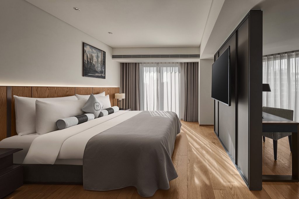 坐落於台北市敦南林蔭大道,綠意盎然、鬧中取靜,致力於提供每位貴賓講究細節的雋永空間與內斂的細膩服務。圖/台北慕軒飯店,臻品之選提供