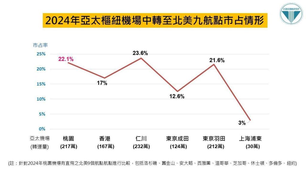 交通部運輸研究所表示,全球航空客運市場全面復甦,以2024年桃園機場直飛北美9個航點為例,這9個機場中,來自東南亞經亞太各樞紐機場之轉運旅客達982萬,桃園機場於此轉運市場表現亮眼,市占率22.1%,略低於仁(23.6%),超越東京羽田、香港、東京成田等競爭對手,顯示桃園機場於此轉運市場具競爭優勢。若以航線別計,其中桃園往舊金山航線轉運旅客量達76萬,傲視亞太。