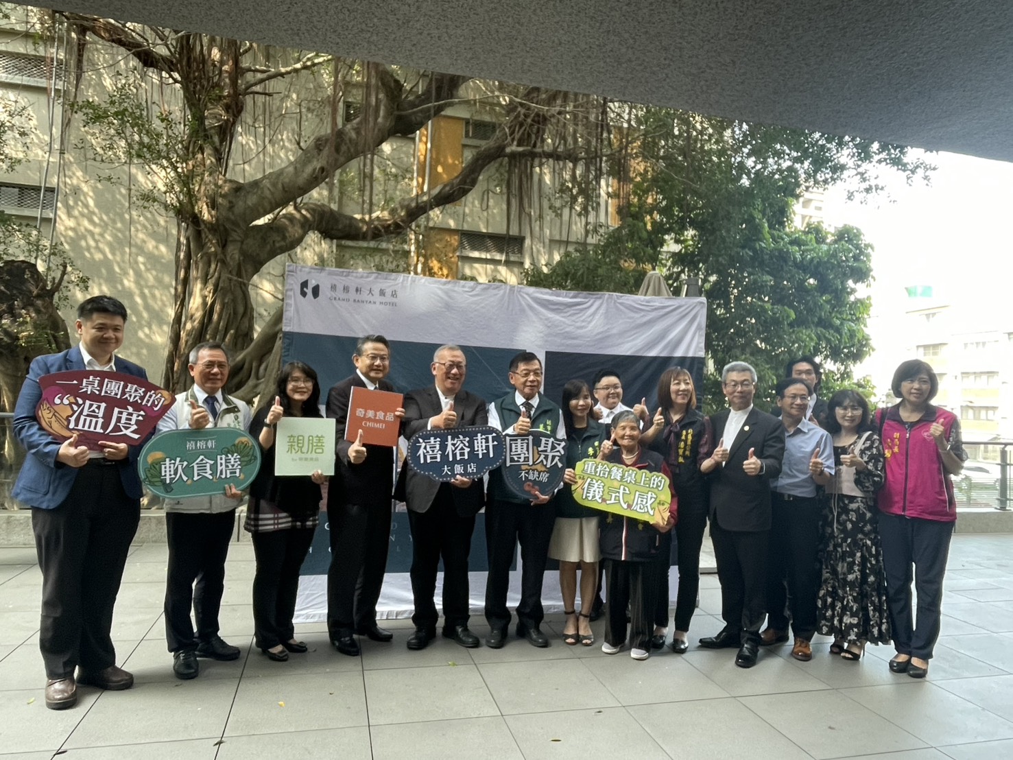 禧榕軒大飯店攜手奇美食品推動「軟食膳」服務,與各界代表共同宣示打造全齡友善餐桌。(記者林怡孜攝)