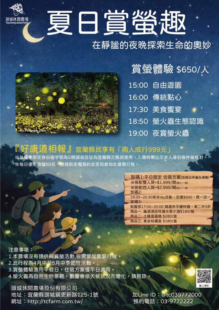 頭城休閒農場二0二六夏日賞螢季自四月十五日至五月十五日,今還加碼1、2、3活動。(頭城休閒農場提供)