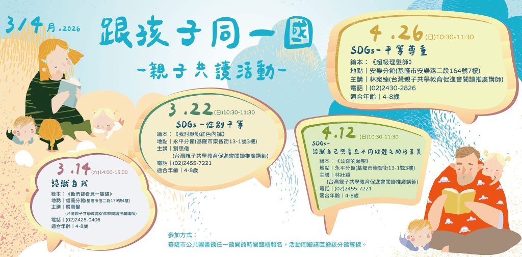 基隆市公共圖書館推動親子共讀與幼兒閱讀教育,四月規劃系列以聯合國永續發展目標(SDGs)為主軸的閱讀推廣活動。(基隆市公共圖書館提供)
