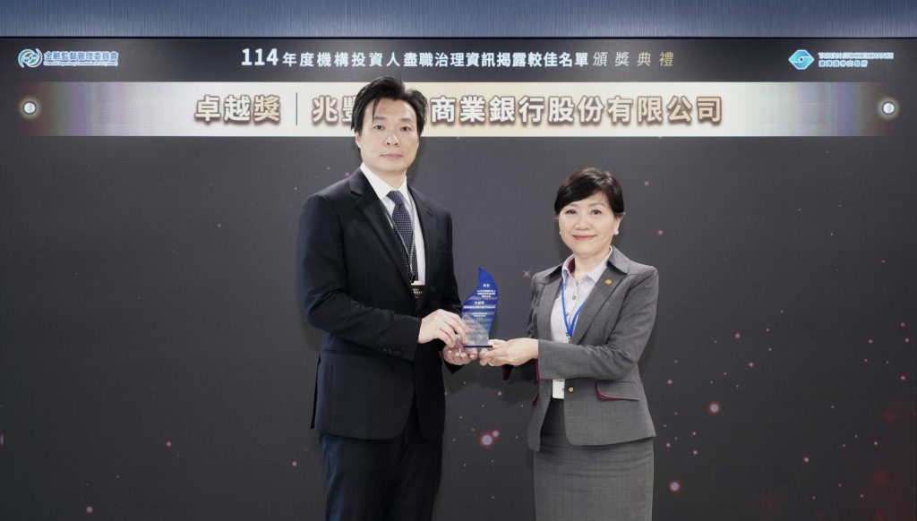 臺灣證券交易所於25日舉辦「114年度機構投資人盡職治理資訊揭露較佳名單」頒獎典禮,邀請金管會證券期貨局、銀行局、保險局以及機構投資人代表共同參與,兆豐銀行以在盡職治理上的卓越表現,再度入選較佳名單,由副總經理陳昭蓉代表受獎。