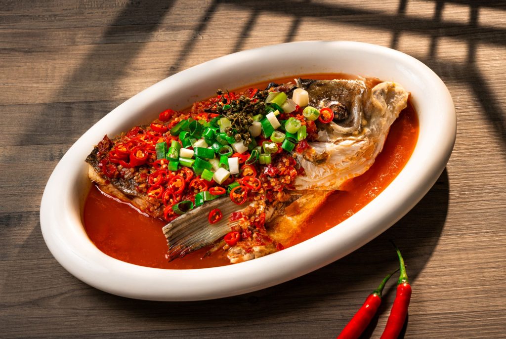 以清麻風味為特色的「藤椒魚頭」,嚴選肉質細嫩的魚頭,搭配多款辣椒製成剁椒醬蒸製入味,最後淋上青花椒油,呈現麻、香、辣層層堆疊的風味表現,售價1,280元。
