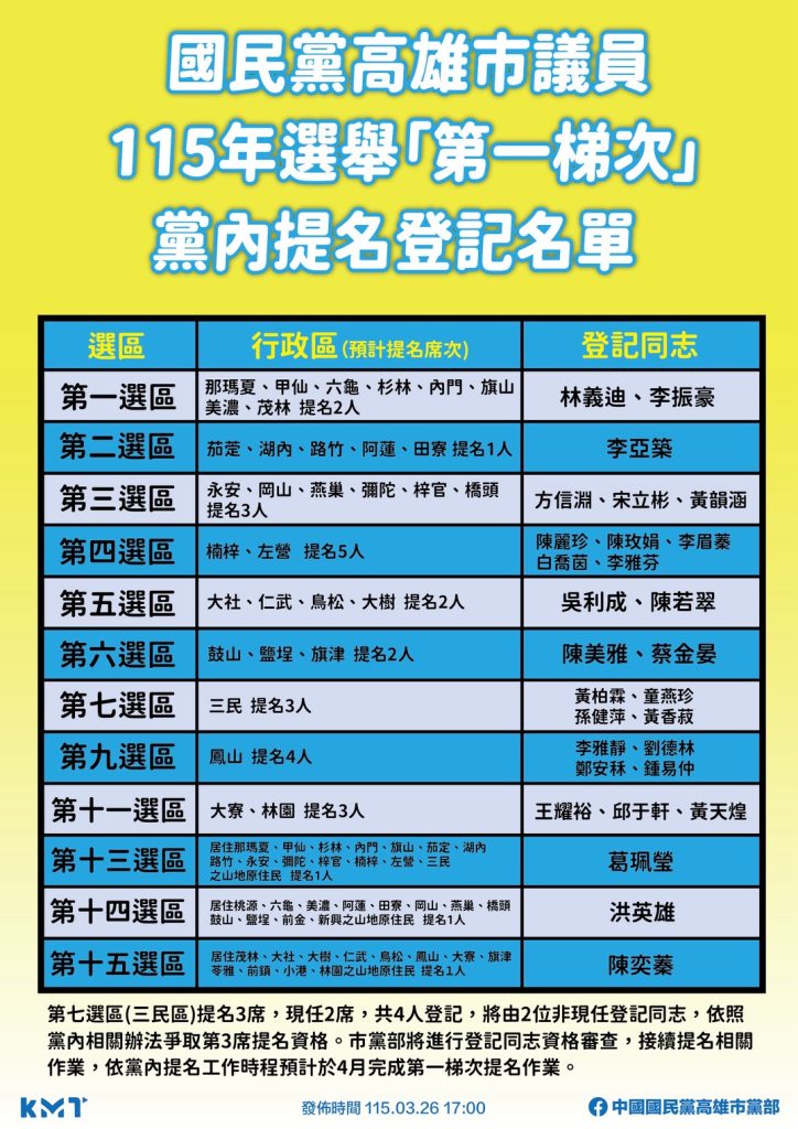 高雄市黨部表示,其中第七選區(三民區)提名三席,現任二席,共四人登記,將由二位非現任登記同志,依照黨內相關辦法爭取第三席提名資格。