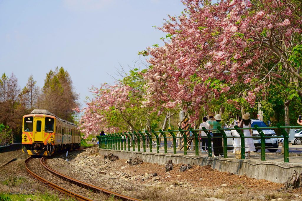 二水花旗木粉色花海沿著台鐵集集支線綿延綻放,列車穿梭其間的夢幻場景,猶如駛進粉紅童話。為方便民眾輕鬆賞花,參山處推薦搭乘「台灣好行|跑水求財線」,自高鐵彰化田中站或台鐵田中站、二水站轉乘,於源泉派出所站下車即可直達花旗木步道。此外,也可於台鐵二水站租借自行車沿二水自行車道騎乘約十五至二十分鐘抵達,沿途串聯農村風光與在地小吃,打造慢遊賞花體驗。