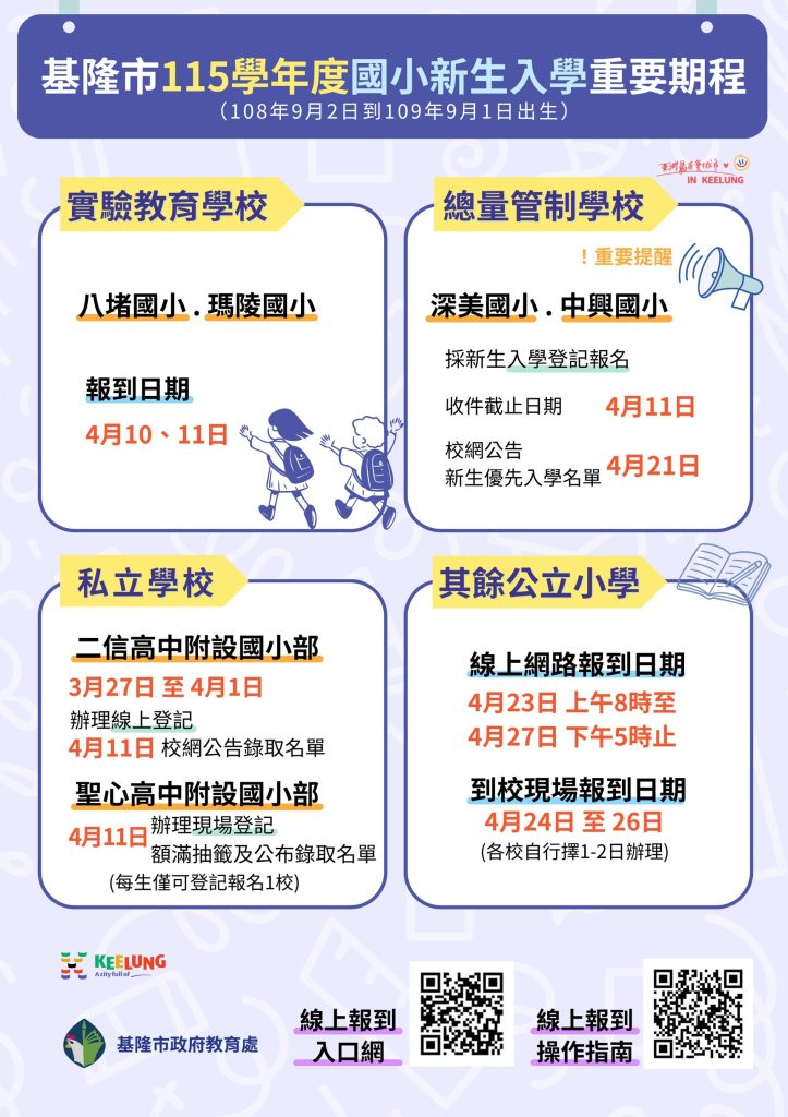 教育處提醒民眾,辦理實驗教育的八堵國小、瑪陵國小與私立小學,除報到時間比一般公立學校提早以外,只要設籍於基隆市內都可以自由申請登記;而設籍於總量管制學校學區的學生,家長在四月八日前會收到新生登記報名通知單,家長們需在四月十一日前將相關文件繳交給學校,學校將於四月二十一日在校網站公告入學名冊,家長們可至學校網站查詢,未錄取學生由學校通知新生家長處理後續事宜。