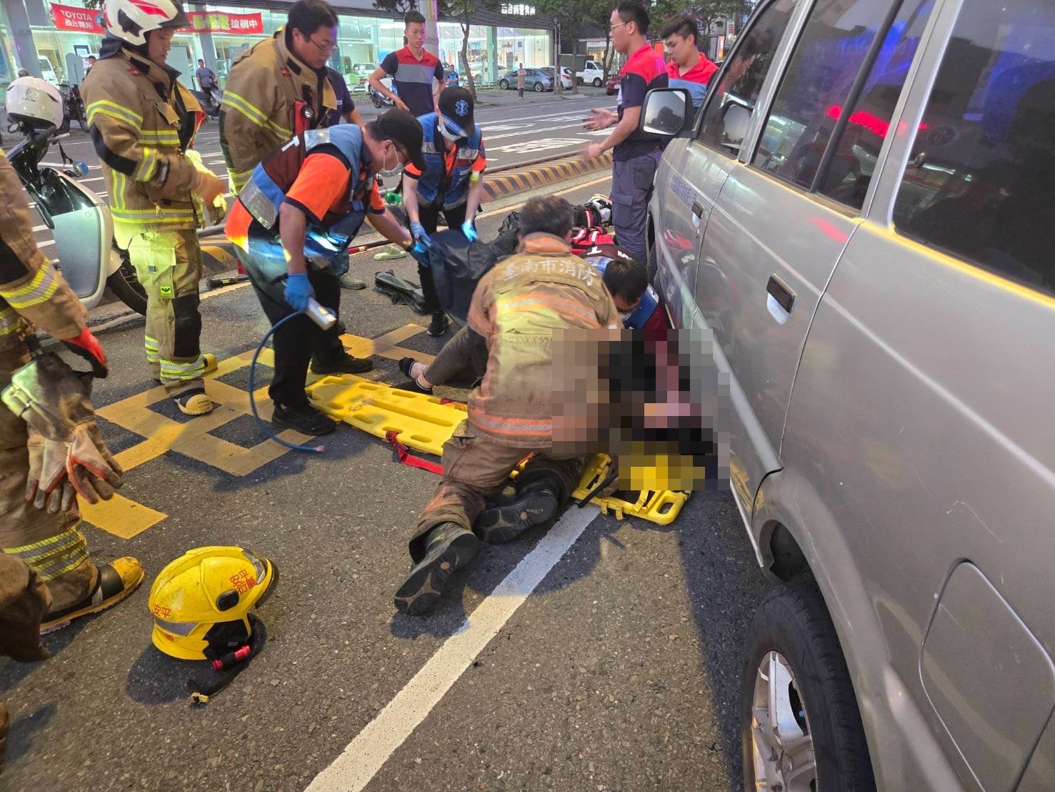 廿五日傍晚六時許,薛姓男子駕駛小貨車沿育平路由南往北行駛,行經路口右轉永華路二段時,撞上同向正在行人穿越道上的黃姓女子,黃女遭撞倒地壓入輪下,受困在車底。警消人員獲報立即到場協助,初步檢視,黃女意識清楚,立即出動機具抬起車輛,將車底的黃女拉出送醫治療。