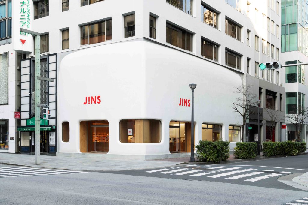 「JINS 銀座店」由世界級建築大師藤本壯介親自操刀設計。在傳承近代日本建築巨匠安東寧・雷蒙(Antonin Raymond)建於 1933 年的名建築「教文館大樓」歷史的同時,巧妙注入了現代的要素。建築外牆包覆著宛如日本和菓子、和紙般柔和的白色,挑戰呈現嶄新的「和」之日式風貌。其中最大的亮點,就在將碎鏡片混入白色塗料,細緻打磨而成的手工牆面塗裝。