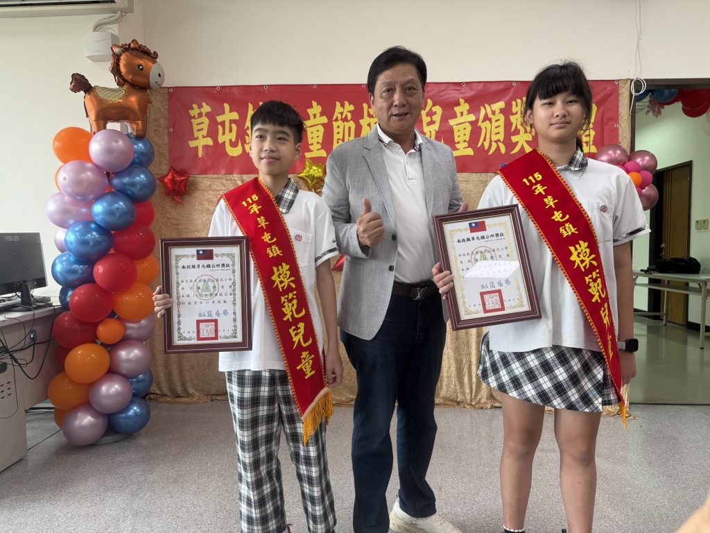 一年一度兒童節即將到來,草屯鎮公所提前於二十七日舉辦「草屯鎮國民小學模範兒童頒獎典禮」,鎮長簡賜勝親自頒獎表揚鎮內炎峰等十四所國小表現優異的模範兒童,勉勵受獎的學子除了功課佳也要好好鍜鍊身體,在家裡當個孝順父母的好孩子。