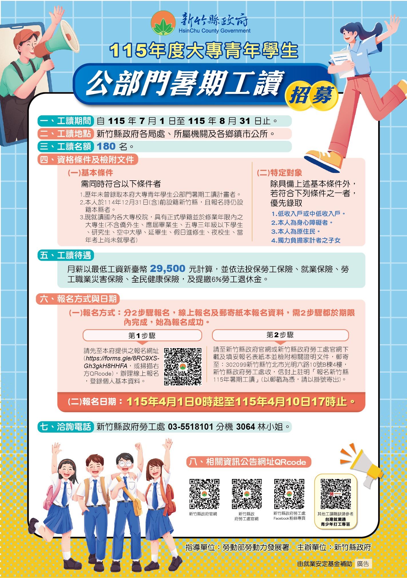 勞工處指出,暑期工讀申請資格為去年十二月卅一日(含)前設籍於新竹縣,現就讀國內各大專校院、過去未曾錄取縣府暑期工讀的在學生,為照顧弱勢族群,身心障礙者、低收入戶、中低收入戶、原住民及獨力負擔家計者之子女將優先錄取。