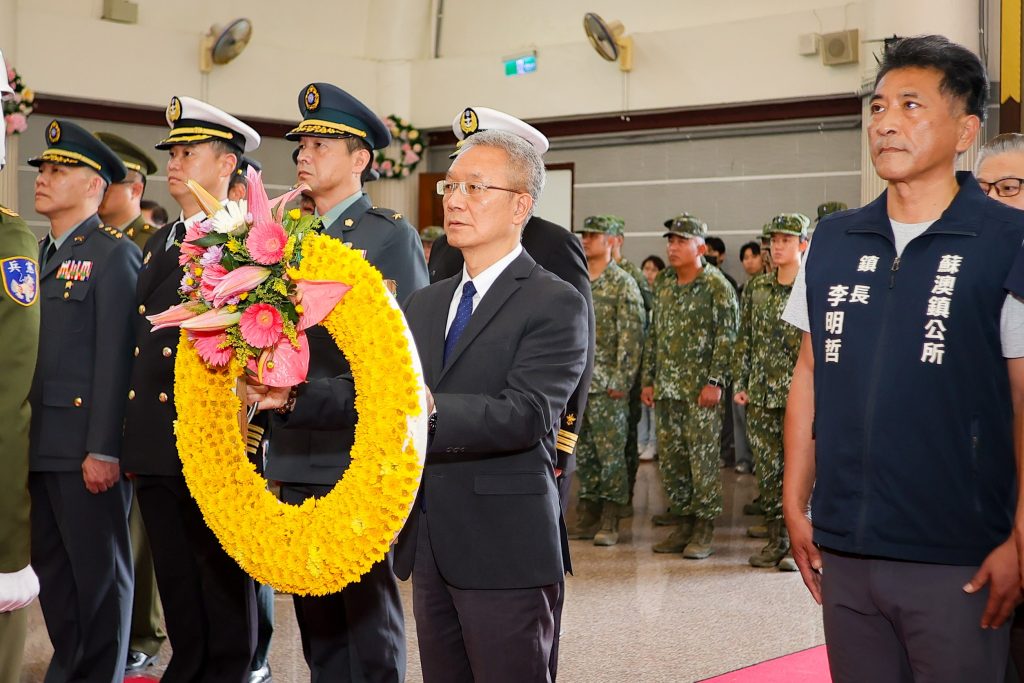 宜蘭縣政府辦理革命先烈及三軍陣亡將士因公殉難官民義士春季祭典,代理縣長林茂盛於軍人忠靈祠擔任主祭官向故三軍將士們追思行禮並向在場家屬致意。(宜蘭縣政府提供)