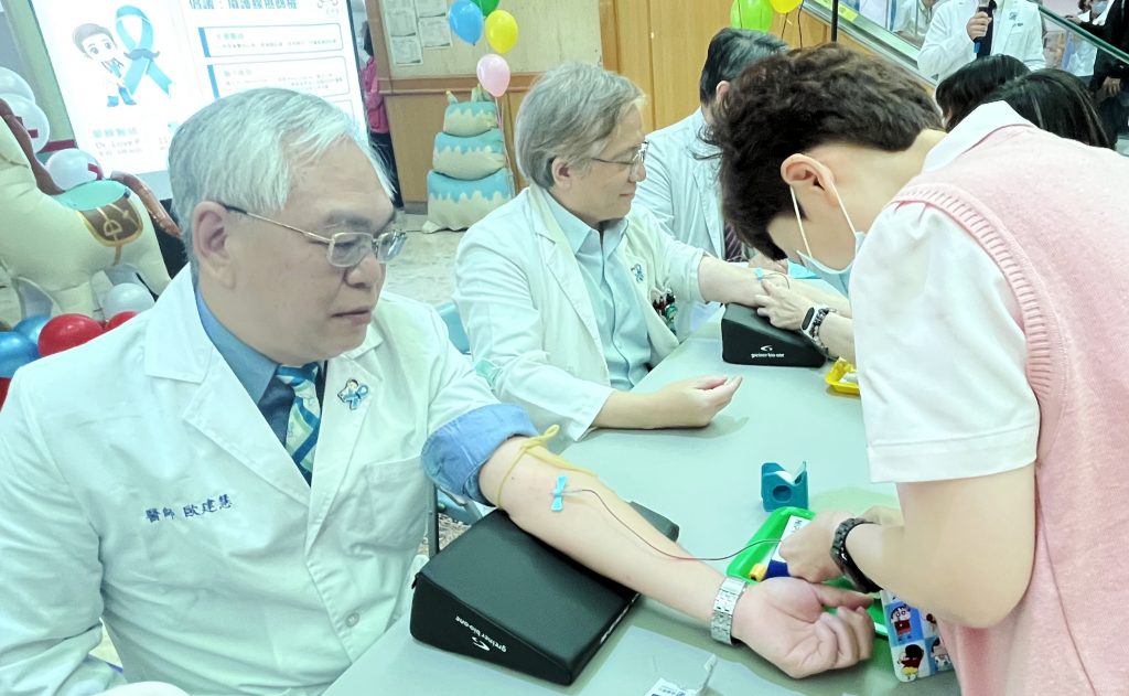 衛生福利部台南醫院院長歐建慧(左一)抽血進行攝護腺癌篩檢。(記者陳治交攝)