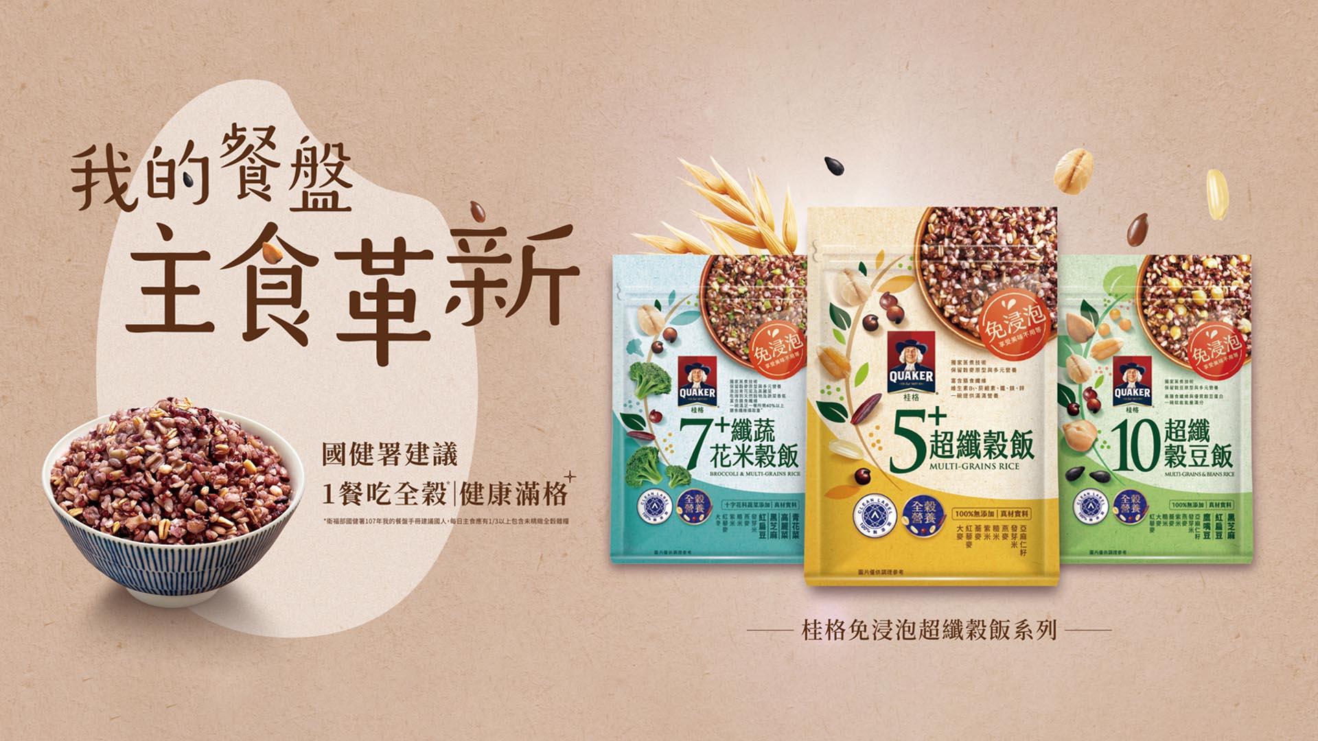隨著民眾對健康飲食的重視程度持續提高,加上外食型態日益普遍,飲食需求已不再僅止於便利取得,而是更加關注營養價值與均衡攝取。桂格長期深耕於全穀飲食的推廣,積極響應國健署「我的餐盤」飲食指南,建議每日主食應有1/3以上包含未精製全榖雜糧,滿足健康需求。