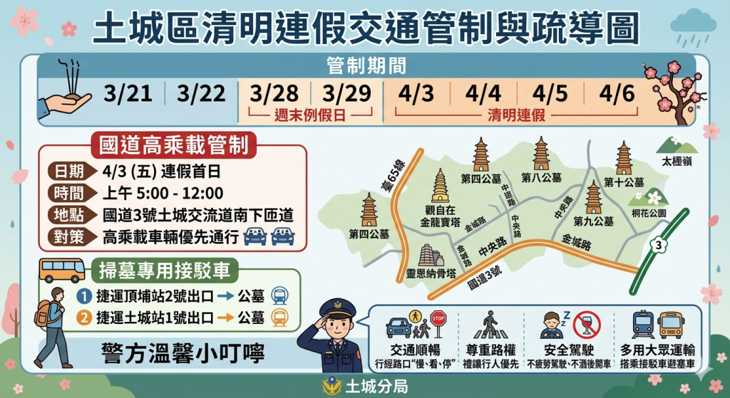 清明節4天連續假期將至,土城警分局為提供民眾順暢掃墓行程,自3月21、22日及28、29日(週末例假日),以及4月3、4、5、6日,加強轄區四大墓園區(第四公墓、第八公墓、第九公墓、第十公墓)、觀自在-金龍寶塔、靈恩納骨塔及承天禪寺、風景遊憩區(桐花公園、太極嶺)與轄內國道3號土城交流道、臺65線快速道路匝道及周邊道路大安路、中央路、金城路、中華路、亞洲路、城林路、擺接堡路、明德路、青雲路、石門路及龍泉路交通疏導,以確保清明節連假期間交通行車順暢及安全。