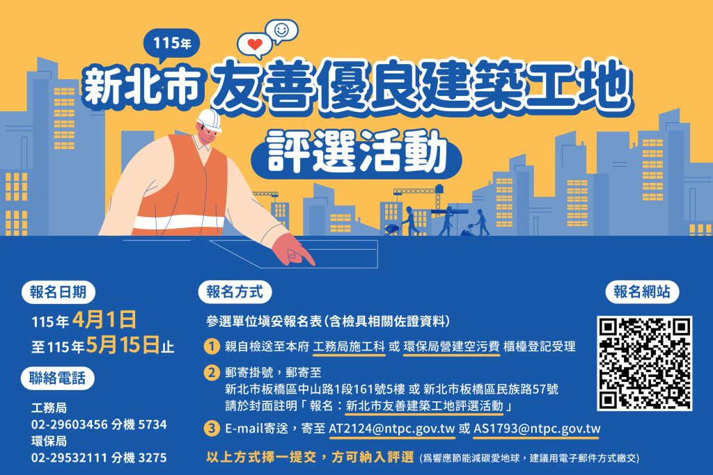 為引領建築產業轉型永續發展,並全面提升工地品質與職業安全環境,新北市政府宣布,115年度「友善建築工地評選活動」將於4月1日至5月15日受理報名,評選將著重「淨零碳排」及「智慧科技」應用,邀請新北市轄區的優秀建築團隊踴躍參選,共同爭取新北工程最高榮譽。