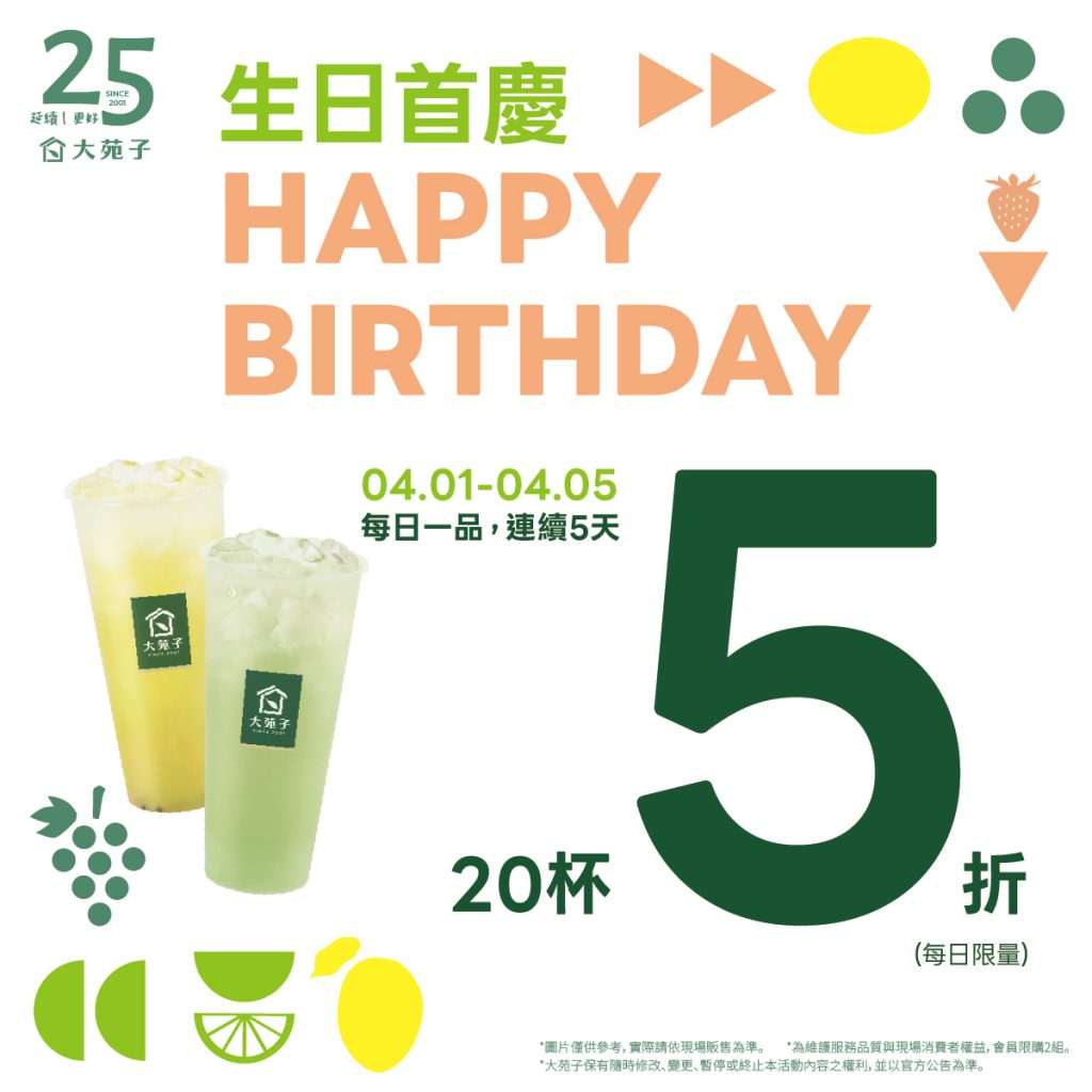大苑子迎來25週年,APP行動商城推出限時活動「HAPPY BIRTHDAY 25!!」,自4月1日至4月5日連續5天祭出「每日一品20杯5折」優惠,每日限量,早上9:00準時開賣,邀請消費者一起共享品牌里程碑的喜悅。