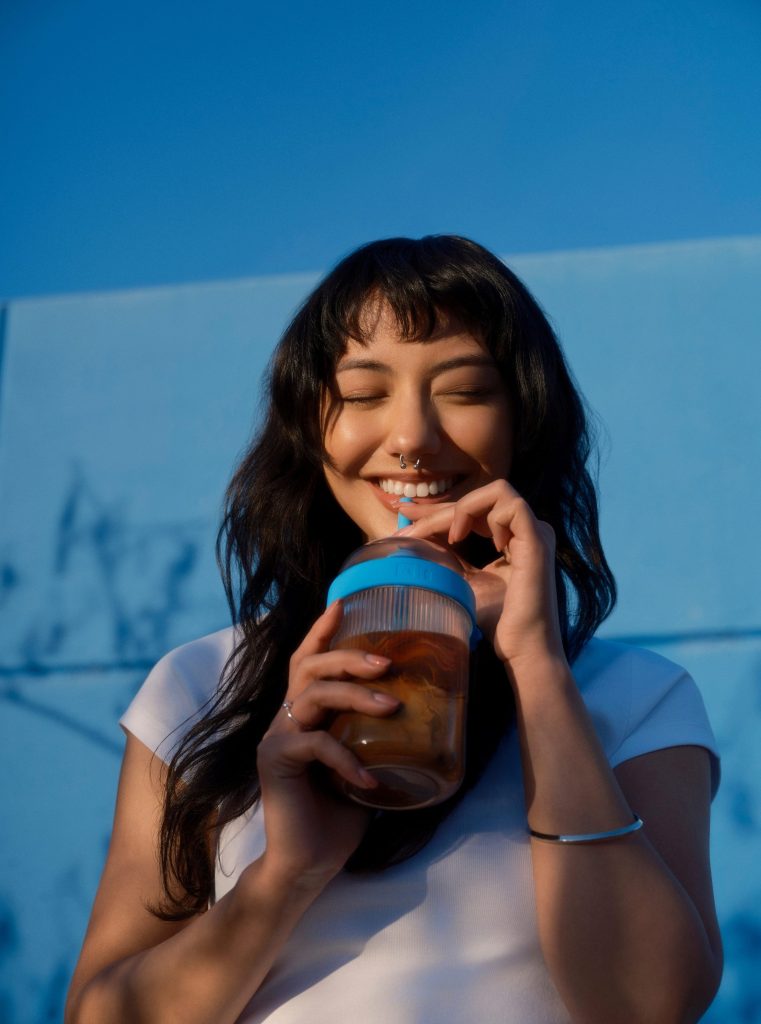 Travel 風格隨行杯 – 藍瓶限量款杯身以細緻垂直紋理的透明外層打造,優雅展現冰咖啡的層次與光影變化,將精品咖啡儀式感化為日常隨行的風格單品。