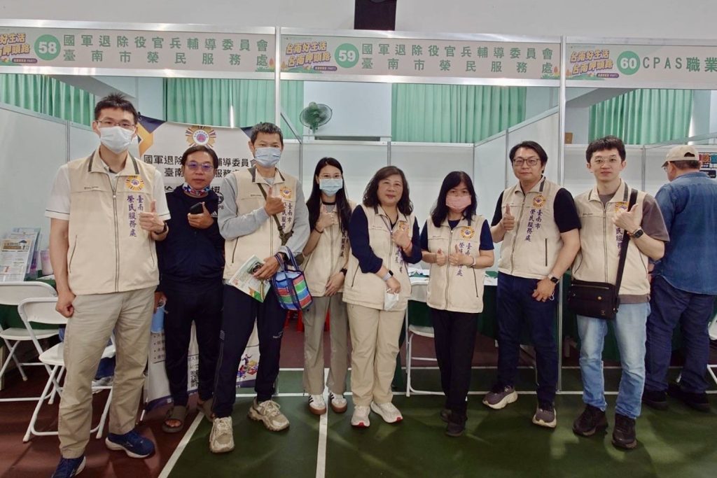 為促進就業及退役官兵各項權益宣導,台南市榮服處日前由副處長徐麗如率輔導組組長及就業站工作團隊,參加市府勞工局在善化區育樂中心舉辦的「台南好生活 台南呷頭路」就業博覽會,在現場設置宣導攤位,向退除役官兵介紹相關的就業資源及職業訓練方案。