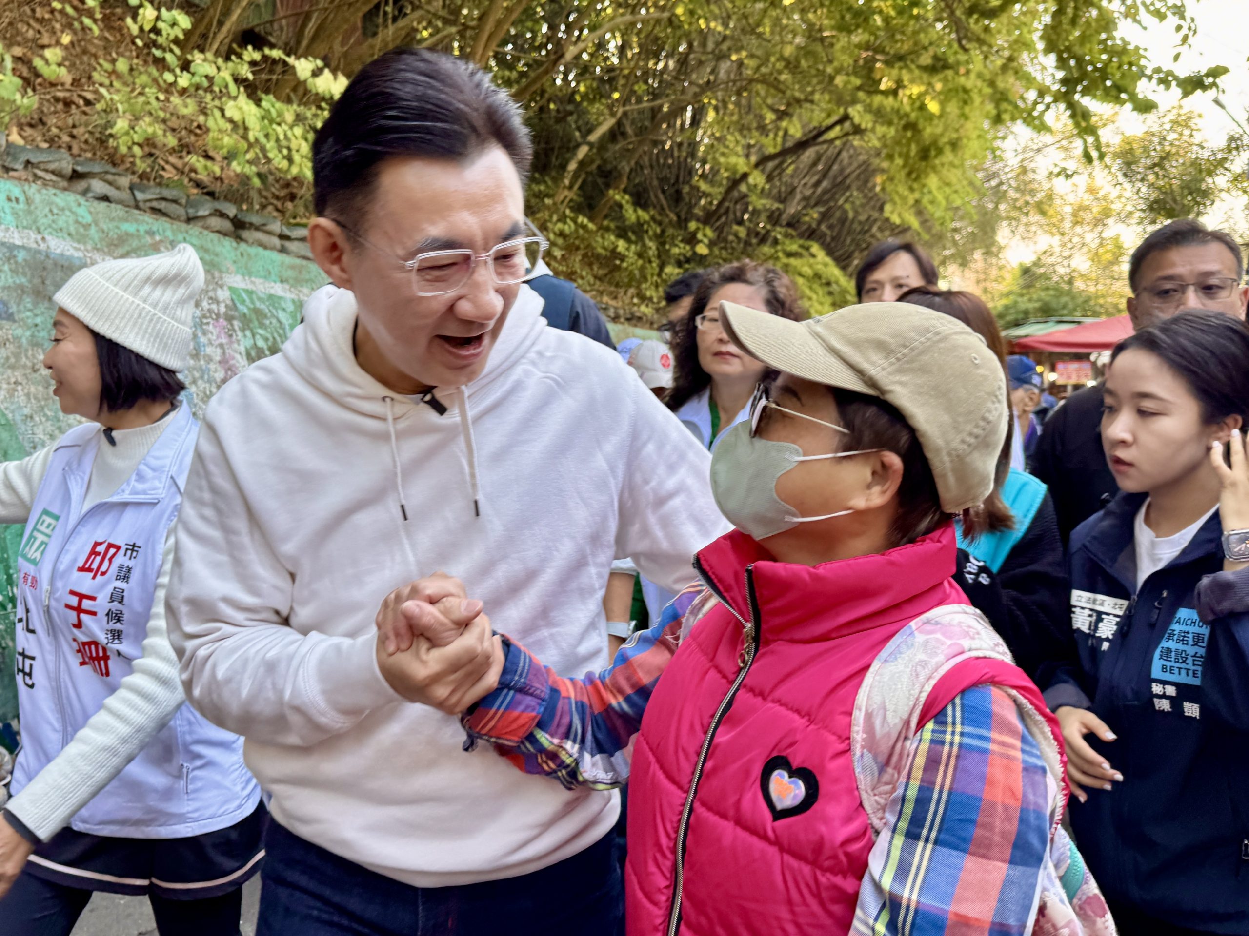 李乾龍牽起楊瓊瓔、蘇柏興的手,齊聲高喊「國民黨加油!台中勝利!」展現台中市長選戰凝聚勝選氣勢。