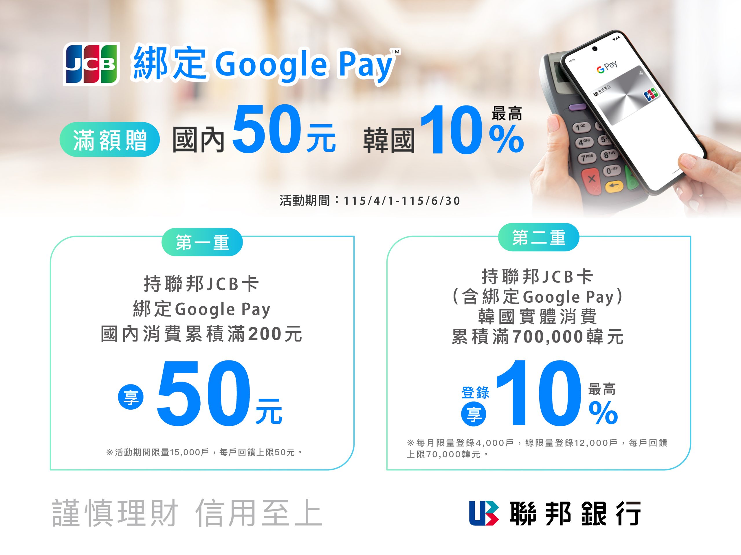 聯邦銀行同時推出限量綁卡好禮,於115年4月1日至115年6月30日,持聯邦JCB卡綁定Google Pay消費,在國內累積滿200元即贈50元刷卡金回饋;此外,趁著韓國旅遊旺季來臨,同步提供高額購物加碼回饋,JCB卡友無論是刷實體卡或綁定Google Pay付款,在韓國實體商店消費累積滿70萬韓元,登錄可享最高10%刷卡金回饋。