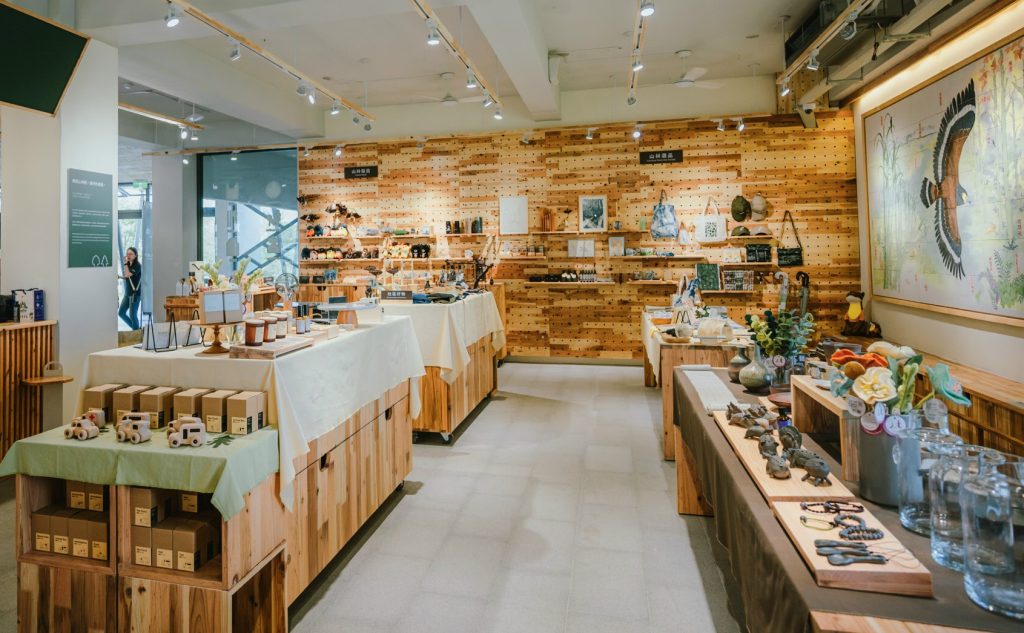 花蓮分署指出,「山林製造X啄木鳥森林」在空間設計上,選品店以「五感體驗」為核心,運用木質建材、自然光影與通風設計,營造溫潤舒適的森林氛圍,牆面藝術則由藝術家劉曉蕙創作,以蔗渣手工紙描繪平地森林從開墾到復育的變遷,成為空間中的敘事亮點。