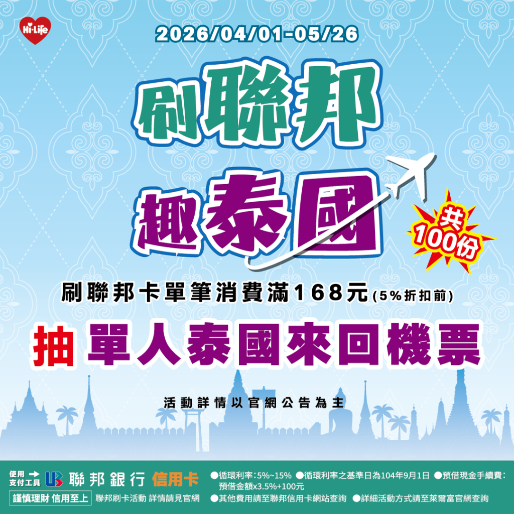 自4月1日至5月26日止,萊爾富主打「春夏泰有感」系列活動,於全台門市推出多款泰國季新品與優惠。活動期間凡於實體門市刷聯邦信用卡單筆消費滿168元(5%折扣前),即可獲得「單人台灣-泰國來回機票」抽獎序號,並於Hi-Life VIP APP內的【來抽獎】活動頁面登錄完成,就有機會抽中價值新台幣8,000元的機票兌換憑證(共100份)。這個春天,萊爾富真的要送你飛泰國!