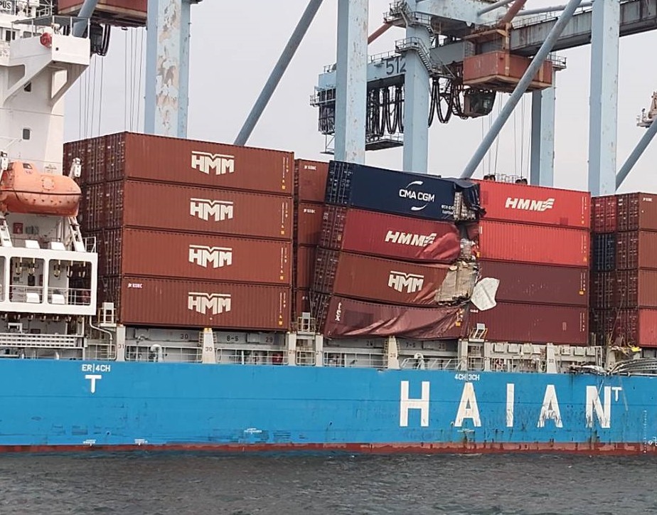 英國籍十四萬九千多噸的貨櫃船「日璽輪」,一日中午十一時許準備從高雄港離港,在港內迴船池迴轉調頭要出港時,船艉不慎碰撞到靠泊在七十七號碼頭的巴拿馬籍一萬八千多噸的貨櫃船「韓遠歐普斯」右側船身,並造成其四個貨櫃掉落碼頭水域,幸無造成人員傷亡,後續進行吊撈作業中。