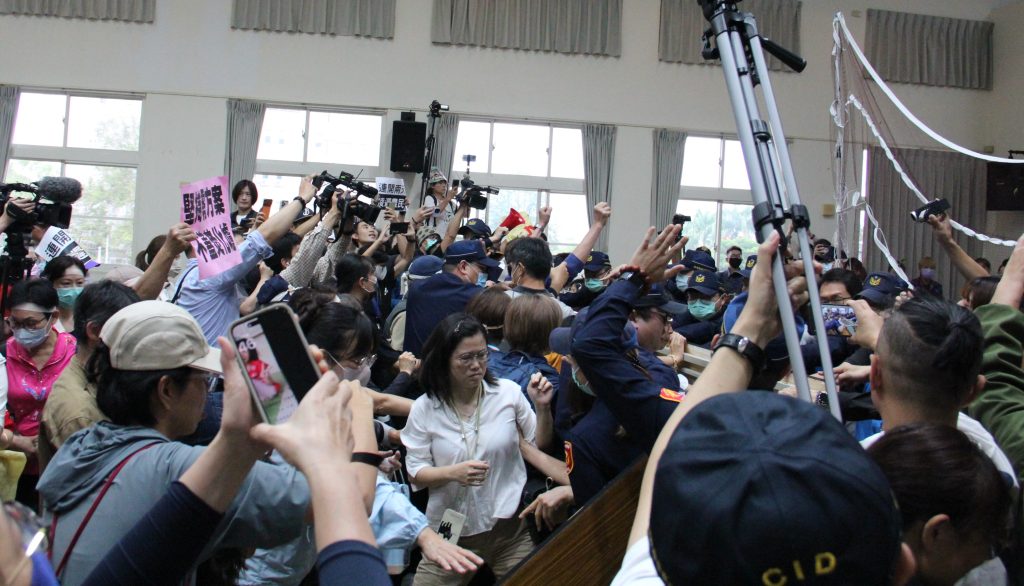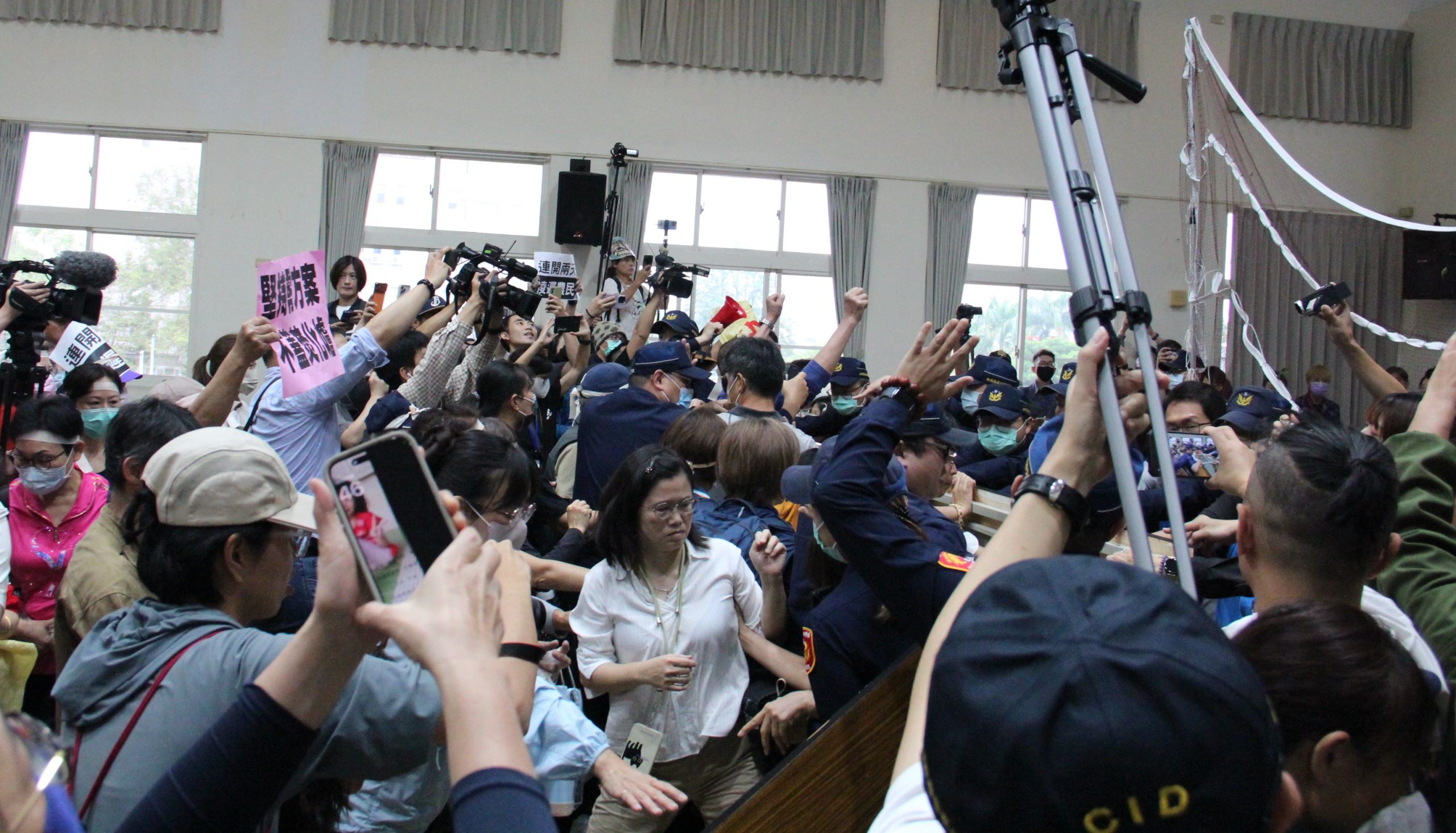 警方試圖緩和對峙情緒,但有抗議民眾突破封鎖,進入環評委員座位區,與員警拉扯,警方架起護網,隨後有人跳上桌子,並開始撒茶葉和冥紙,為防止人員受傷,員警上前維持秩序,現場瞬間衍成推擠衝突。