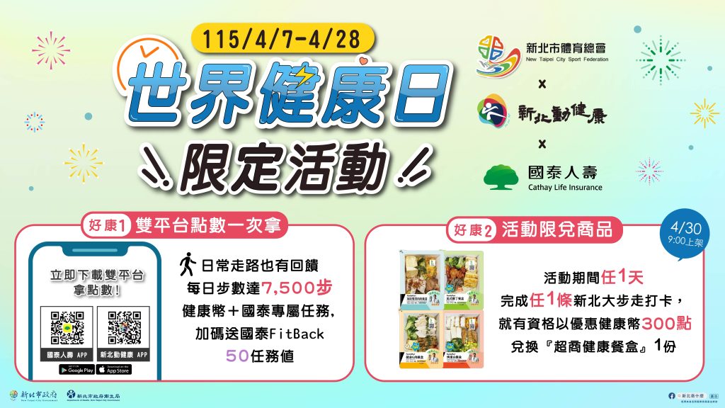 為響應4月7日「世界健康日」,在新北市體育總會大力推動全民運動風氣的引領下,新北市衛生局整合「新北動健康」平台資源,攜手國泰人壽推出「雙平台回饋」,鼓勵市民培養規律運動習慣,將運動融入日常生活,打造健康生活型態。