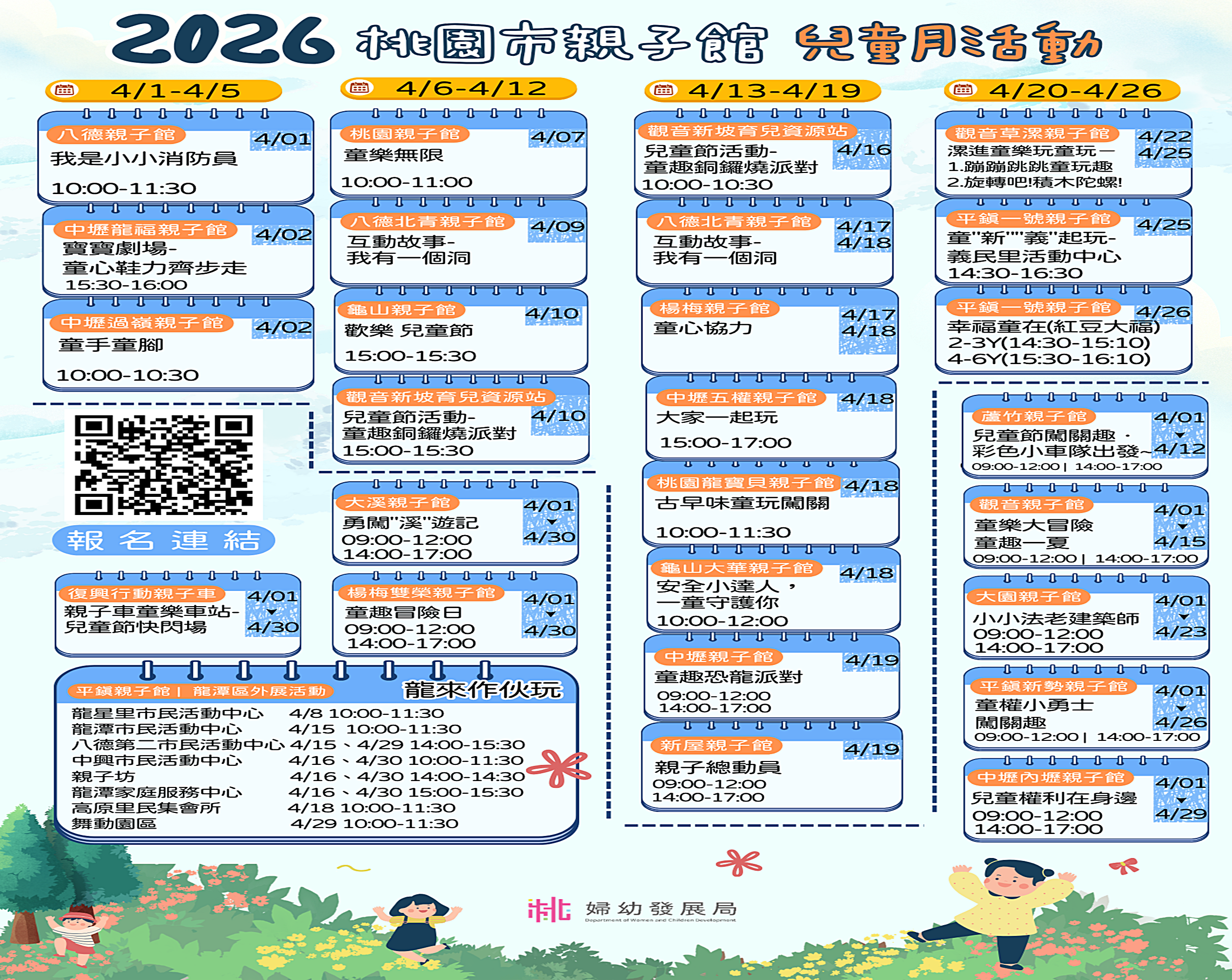 從館內體驗到社區巡迴活動,整個四月精彩不間斷,誠摯邀請家長帶著孩子一起走進親子館,開心玩、安心學,共同留下充滿笑聲的美好回憶。歡迎有興趣的家長踴躍參與各親子館兒童月系列活動及「春日田園嘉年華」,相關活動資訊及報名均可透過「桃園育兒資源網」線上辦理。