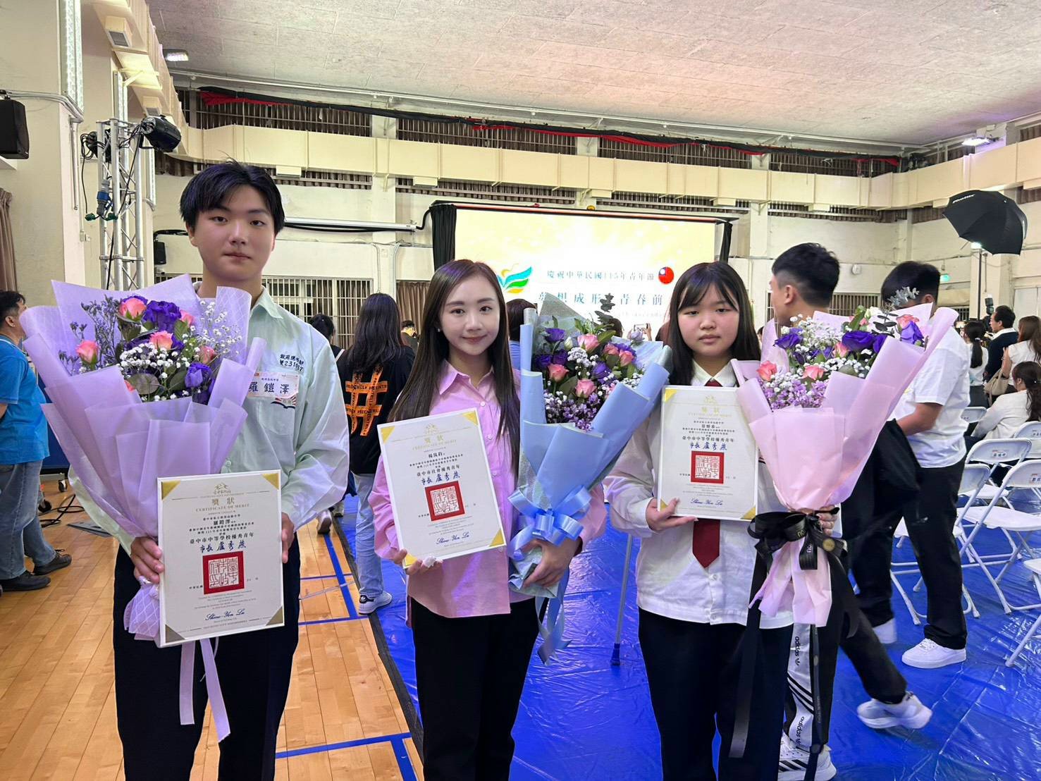 餐飲科羅鎧澤同學(左一)、致用高中輔導室楊筑鈞主任(中)及餐飲科蔡妍希同學(右一)在慶祝115年青年節優秀青年表揚大會上接受表揚殊榮。(記者陳榮昌攝)