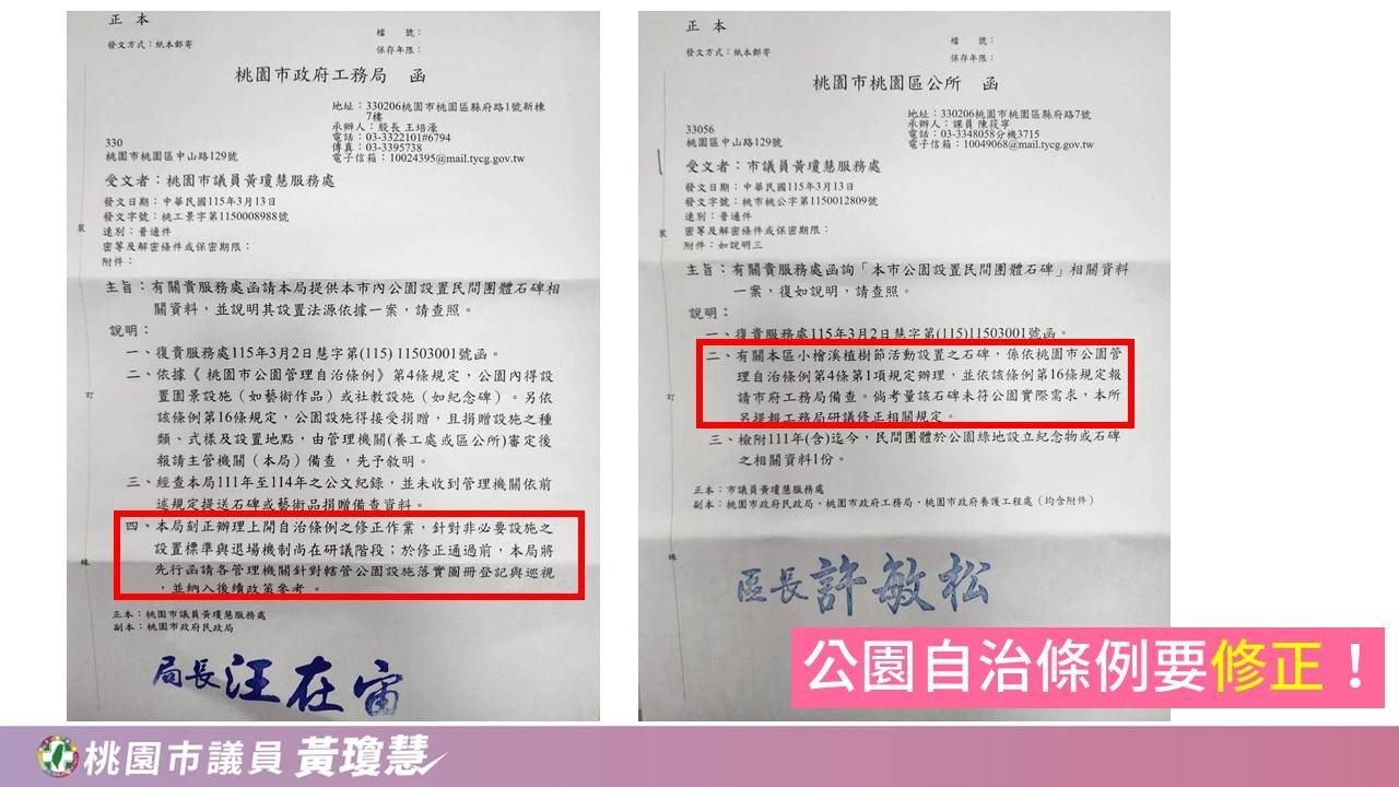 最後,黃瓊慧強調,市府應拿出更明確態度,全面檢討《桃園市公園委託經營及認養管理辦法》,杜絕「假植樹、真宣傳」的立碑文化,讓公共空間回歸乾淨、舒適與公平,真正還給全體市民共享。