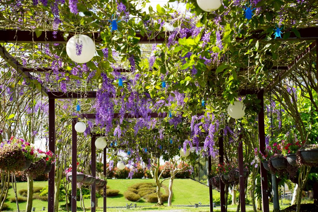 錫葉藤又稱許願藤,有「天使之顏」之稱,每年三至四月與十一月為主要花期。盛開時紫花成串垂掛,隨風搖曳,與日式庭園及百年古厝相互映襯,展現春季獨有的浪漫景致。許願藤色澤偏深、花型較為緊密,呈現不同的觀賞風貌。不論是賞景遊客或想放慢步調的旅人,都能在花廊間感受季節之美。