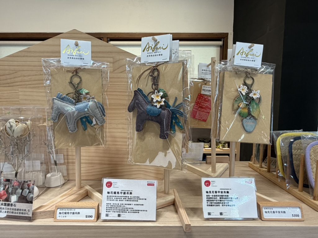 南市勞工局為晴天坊夥伴開拓手工藝品展售新據點,相中麻豆區總爺藝文中心,以「柚見花香平安吊飾」、「柚花耀馬守護吊飾」在總爺小舖限定販售,麻豆文旦柚享有盛名,精心挑選具柚花意象、結合馬年主題的手作藝品試水溫。