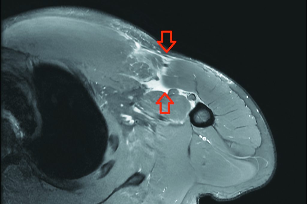 核磁共振檢查發現其右側胸大肌斷裂。