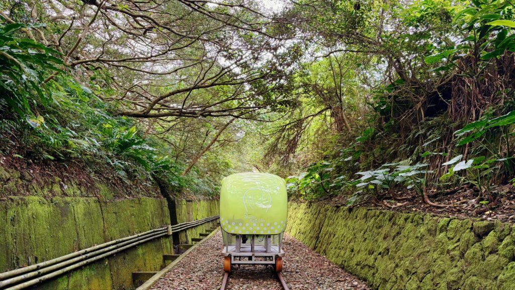 可愛的河豚車穿梭在綠意盎然的鐵道廊帶中,展現出將廢棄軌道成功活化並帶動區域共好的核心價值。(新北市觀旅局提供)