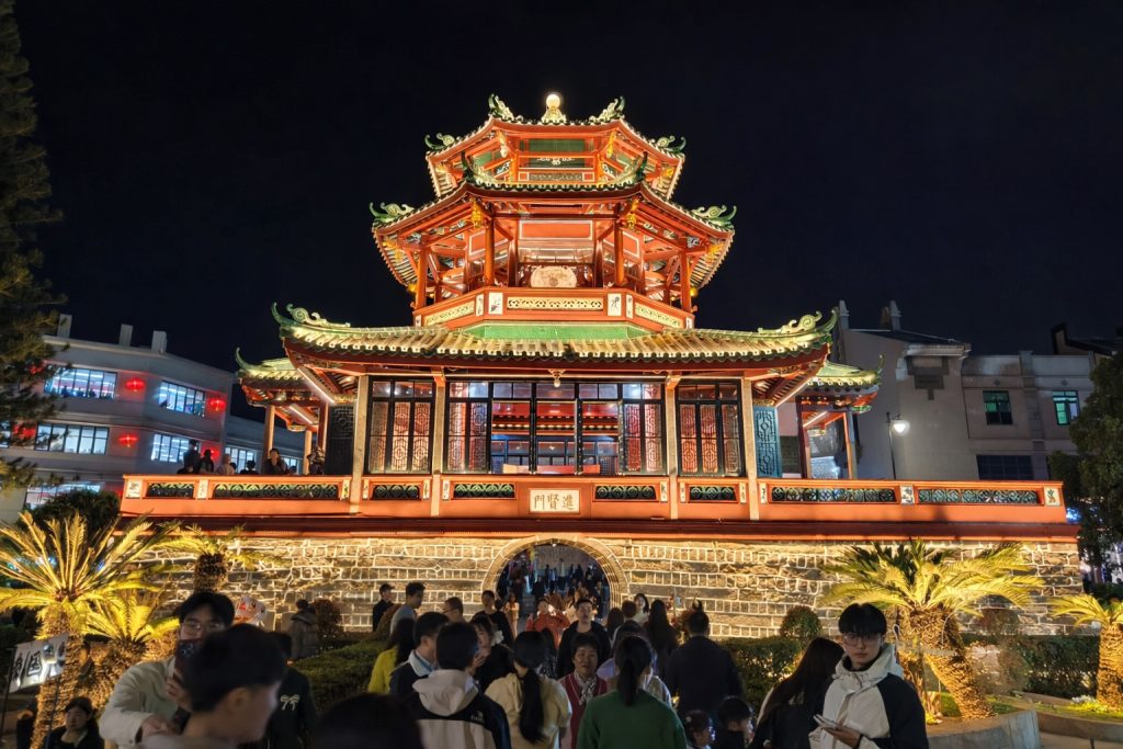古城始建於南宋紹興年間,歷經千年歲月淬鍊,至今仍保存完整的歷史肌理,進賢門巍然矗立,與青磚黛瓦相映成趣,夜幕低垂時,串燈如星河閃耀,為古城披上一層流光溢彩的外衣。中山路與思賢路如同時光的軸線,串聯起古城的歷史記憶與當代生活,騎樓拱廊間斑駁牆面訴說歲月痕跡,而紅燈籠與創意裝置則注入現代活力。