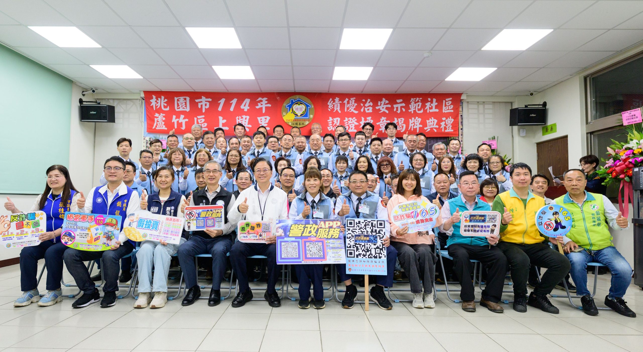 桃園市長張善政二日出席「一一四年績優治安示範社區—蘆竹區上興里頒獎典禮」,張善政表示,上興里守望相助隊成軍不久,但在極短時間內展現優異成果,榮獲績優治安社區殊榮,實屬不易。桃園市日前甫獲全國社區治安評比特優,上興里的表現亮眼,期盼未來持續精進治安網絡,攜手打造宜居城市。