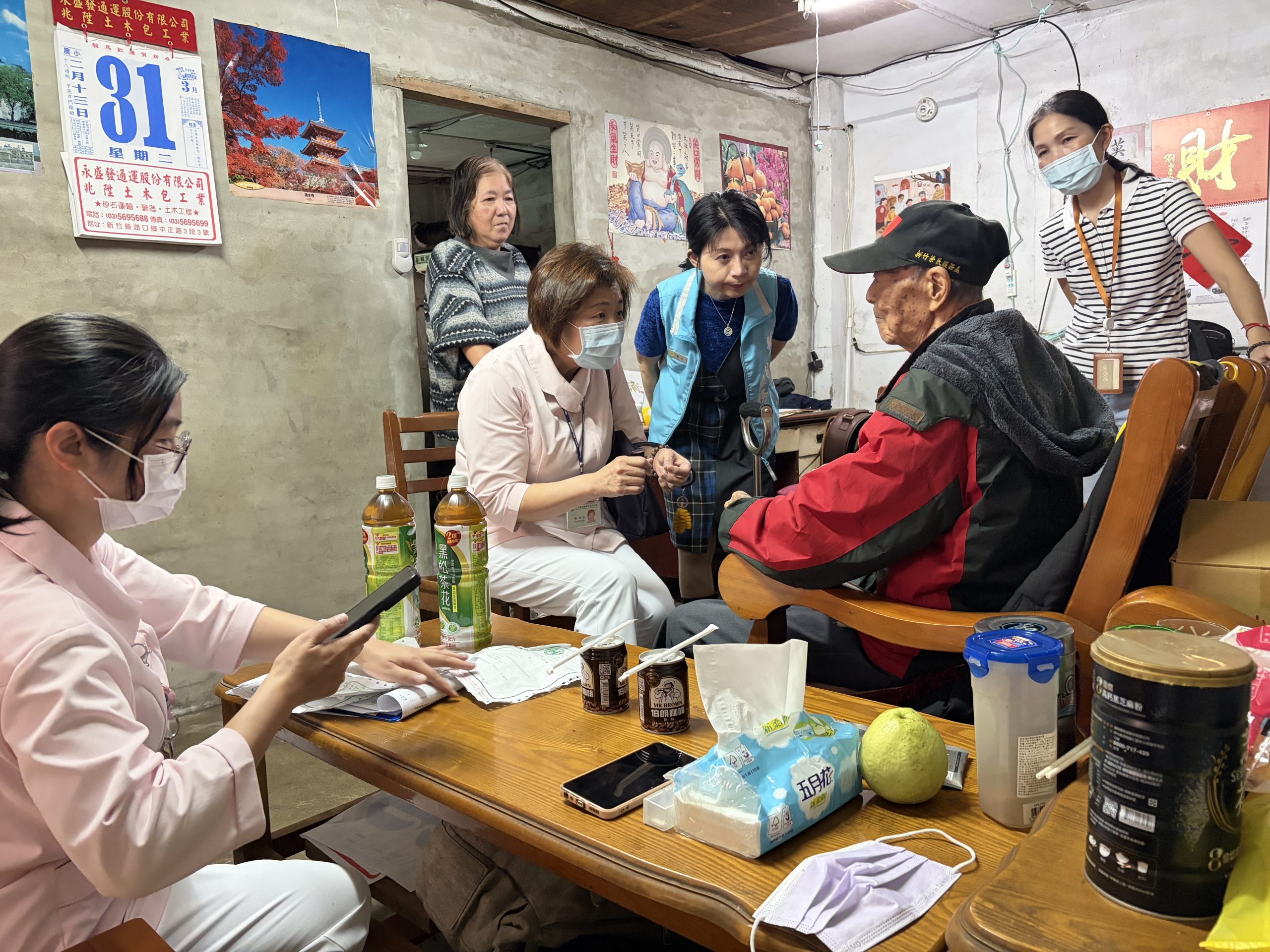 護理師展現專業與耐心,為伯伯進行清創與消毒;護理長也教導鄰托人楊女士正確的換藥技巧;榮服處黃組長則代表榮服處送上滋補的滴雞精,並仔細測試遠距居家通報系統。