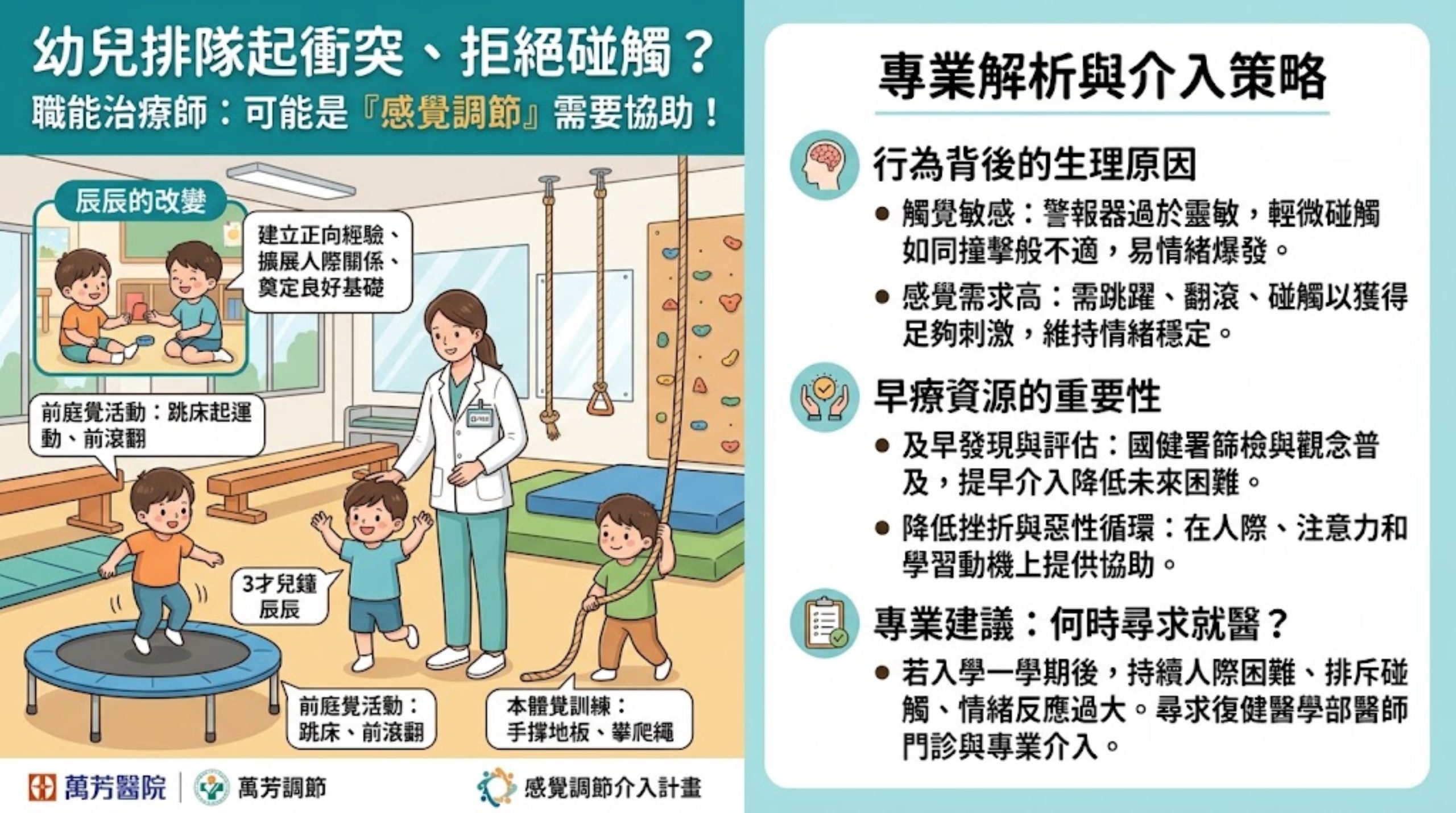 3歲的辰辰(化名)入讀幼兒園半年多,經常無法乖乖排隊,只要同學輕微碰觸就情緒激動,甚至引發肢體衝突;玩玩具時也因他人靠近而生氣,對團體生活造成影響,就醫評估,才發現問題並非單純行為偏差,而是感覺調節功能需要專業協助。